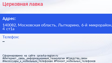 Церковная лавка по адресу 140082, Московская область, Лыткарино, 6-й микрорайон, 4 ст1а в дальнейшем Организация, размещена в следующих категориях: