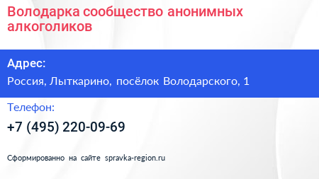 Володарка, сообщество анонимных алкоголиков по адресу Церковь Николая Чудотворца, 17, Центральная улица, Большая Володарка, посёлок Володарского, Ленинский городской округ, Московская область, Центральный федеральный округ, 142713, Россия в дальнейшем Организация, размещена в следующих категориях: