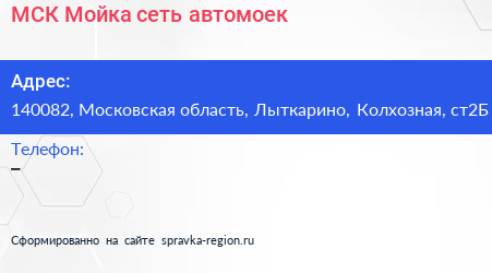 МСК Мойка, сеть автомоек по адресу 140082, Московская область, Лыткарино, Колхозная, ст2Б в дальнейшем Организация, размещена в следующих категориях: