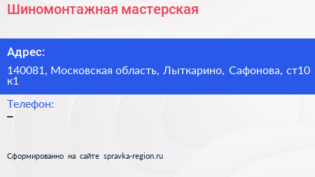 Шиномонтажная мастерская по адресу 140081, Московская область, Лыткарино, Сафонова, ст10 к1 в дальнейшем Организация, размещена в следующих категориях: