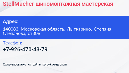 StellMacher, шиномонтажная мастерская по адресу 140083, Московская область, Лыткарино, Степана Степанова, ст30е в дальнейшем Организация, размещена в следующих категориях: