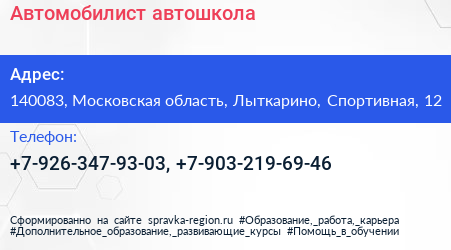 Автомобилист, автошкола по адресу 140083, Московская область, Лыткарино, Спортивная, 12 в дальнейшем Организация, размещена в следующих категориях: