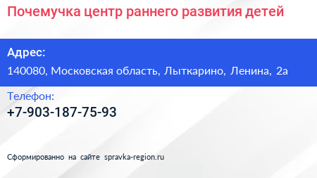 Почемучка, центр раннего развития детей по адресу 140080, Московская область, Лыткарино, Ленина, 2а в дальнейшем Организация, размещена в следующих категориях: