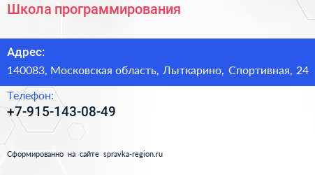 Школа программирования по адресу 140083, Московская область, Лыткарино, Спортивная, 24 в дальнейшем Организация, размещена в следующих категориях: