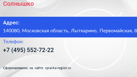 Солнышко по адресу 140080, Московская область, Лыткарино, Первомайская, 8 в дальнейшем Организация, размещена в следующих категориях: