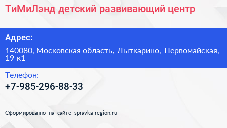 ТиМиЛэнд, детский развивающий центр по адресу 140080, Московская область, Лыткарино, Первомайская, 19 к1 в дальнейшем Организация, размещена в следующих категориях:
