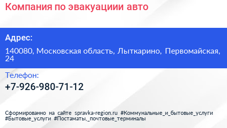 Компания по эвакуациии авто по адресу 140080, Московская область, Лыткарино, Первомайская, 24 в дальнейшем Организация, размещена в следующих категориях: