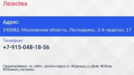ЛеонЭва по адресу 140082, Московская область, Лыткарино, 2-й квартал, 17 в дальнейшем Организация, размещена в следующих категориях: