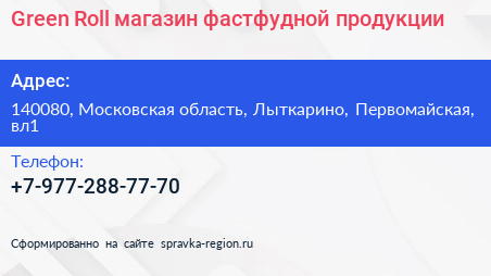 Green Roll, магазин фастфудной продукции по адресу 140080, Московская область, Лыткарино, Первомайская, вл1 в дальнейшем Организация, размещена в следующих категориях: