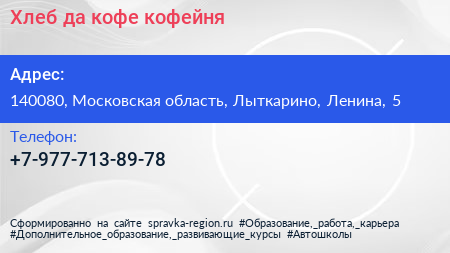 Хлеб да кофе, кофейня по адресу 140080, Московская область, Лыткарино, Ленина, 5 в дальнейшем Организация, размещена в следующих категориях: