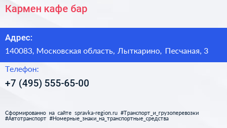 Кармен, кафе-бар по адресу 140083, Московская область, Лыткарино, Песчаная, 3 в дальнейшем Организация, размещена в следующих категориях: