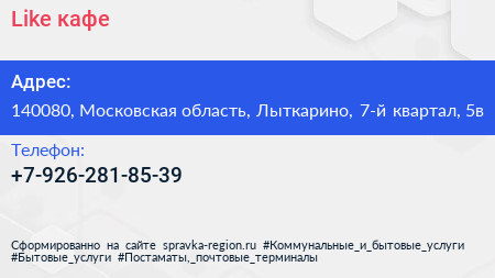 Like, кафе по адресу 140080, Московская область, Лыткарино, 7-й квартал, 5в в дальнейшем Организация, размещена в следующих категориях: