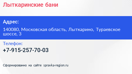Лыткаринские бани по адресу 140080, Московская область, Лыткарино, Тураевское шоссе, 3 в дальнейшем Организация, размещена в следующих категориях:
