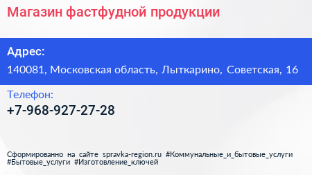 Магазин фастфудной продукции по адресу 140081, Московская область, Лыткарино, Советская, 16 в дальнейшем Организация, размещена в следующих категориях: