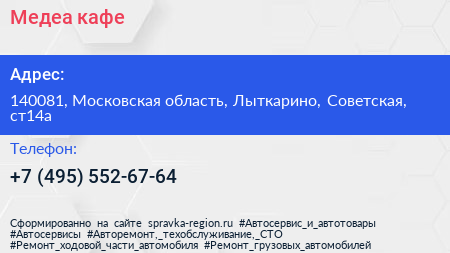 Медеа, кафе по адресу 140081, Московская область, Лыткарино, Советская, ст14а в дальнейшем Организация, размещена в следующих категориях: