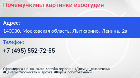 Почемучкины картинки, изостудия по адресу 140080, Московская область, Лыткарино, Ленина, 2а в дальнейшем Организация, размещена в следующих категориях: