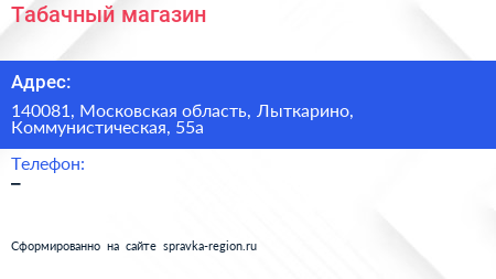 Табачный магазин по адресу 140081, Московская область, Лыткарино, Коммунистическая, 55а в дальнейшем Организация, размещена в следующих категориях:
