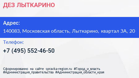 ДЕЗ-ЛЫТКАРИНО по адресу 140083, Московская область, Лыткарино, квартал ЗА, 20 в дальнейшем Организация, размещена в следующих категориях: