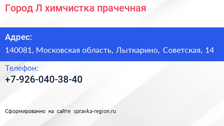 Город-Л, химчистка-прачечная по адресу 140081, Московская область, Лыткарино, Советская, 14 в дальнейшем Организация, размещена в следующих категориях: