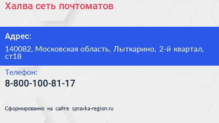 Халва, сеть почтоматов по адресу 140082, Московская область, Лыткарино, 2-й квартал, ст18 в дальнейшем Организация, размещена в следующих категориях: