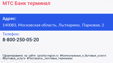 МТС-Банк, терминал по адресу 140083, Московская область, Лыткарино, Парковая, 2 в дальнейшем Организация, размещена в следующих категориях: