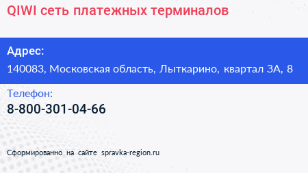 QIWI, сеть платежных терминалов по адресу 140083, Московская область, Лыткарино, квартал ЗА, 8 в дальнейшем Организация, размещена в следующих категориях: