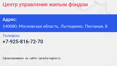Центр управления жилым фондом по адресу 140080, Московская область, Лыткарино, Песчаная, 8 в дальнейшем Организация, размещена в следующих категориях: