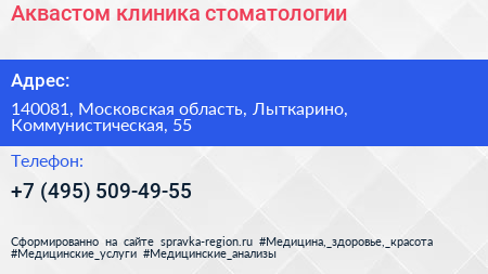 Аквастом, клиника стоматологии по адресу 140081, Московская область, Лыткарино, Коммунистическая, 55 в дальнейшем Организация, размещена в следующих категориях: