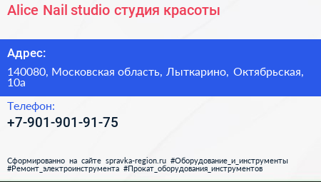 Alice Nail studio, студия красоты по адресу 140080, Московская область, Лыткарино, Октябрьская, 10а в дальнейшем Организация, размещена в следующих категориях: