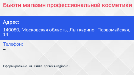 Бьюти, магазин профессиональной косметики по адресу 140080, Московская область, Лыткарино, Первомайская, 14 в дальнейшем Организация, размещена в следующих категориях: