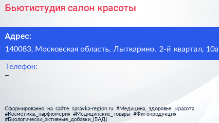 Бьютистудия, салон красоты по адресу 140083, Московская область, Лыткарино, 2-й квартал, 10а в дальнейшем Организация, размещена в следующих категориях: