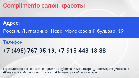 Complimento, салон красоты по адресу 19, Ново-Молоковский бульвар, Жилой комплекс "Ново-Молоково", Молоково, Ленинский городской округ, Московская область, Центральный федеральный округ, 142714, Россия в дальнейшем Организация, размещена в следующих категориях: