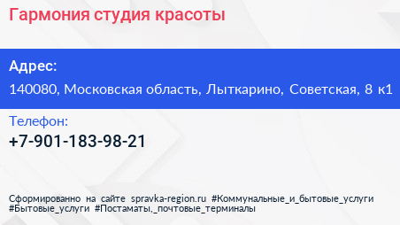 Гармония, студия красоты по адресу 140080, Московская область, Лыткарино, Советская, 8 к1 в дальнейшем Организация, размещена в следующих категориях: