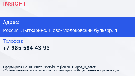 INSIGHT по адресу 4, Ново-Молоковский бульвар, Жилой комплекс "Ново-Молоково", Молоково, Ленинский городской округ, Московская область, Центральный федеральный округ, 142714, Россия в дальнейшем Организация, размещена в следующих категориях: