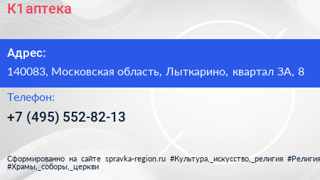 К1, аптека по адресу 140083, Московская область, Лыткарино, квартал ЗА, 8 в дальнейшем Организация, размещена в следующих категориях: