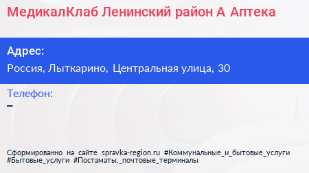 МедикалКлаб Ленинский район А, Аптека по адресу ТФ "Возрождение", 30А, Центральная улица, Большая Володарка, посёлок Володарского, Ленинский городской округ, Московская область, Центральный федеральный округ, 142713, Россия в дальнейшем Организация, размещена в следующих категориях: