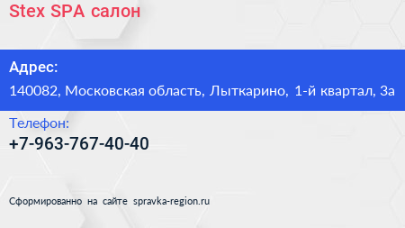 Stex, SPA-салон по адресу 140082, Московская область, Лыткарино, 1-й квартал, 3а в дальнейшем Организация, размещена в следующих категориях: