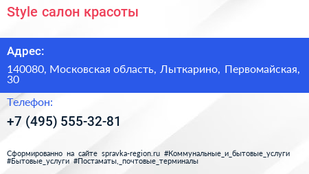 Style, cалон красоты по адресу 140080, Московская область, Лыткарино, Первомайская, 30 в дальнейшем Организация, размещена в следующих категориях: