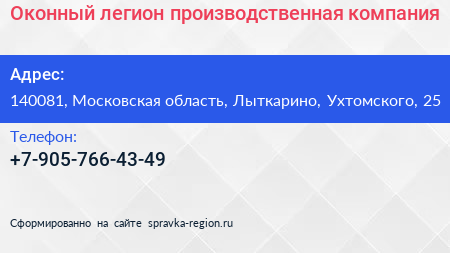 Оконный легион, производственная компания по адресу 140081, Московская область, Лыткарино, Ухтомского, 25 в дальнейшем Организация, размещена в следующих категориях: