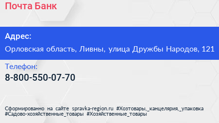 Почта Банк по адресу Орловская область, Ливны, улица Дружбы Народов, 121 в дальнейшем Организация, размещена в следующих категориях: