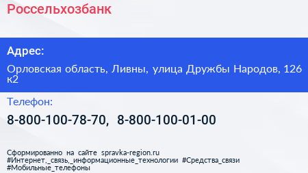 Россельхозбанк по адресу Орловская область, Ливны, улица Дружбы Народов, 126 к2 в дальнейшем Организация, размещена в следующих категориях: