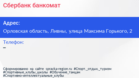 Сбербанк, банкомат по адресу Орловская область, Ливны, улица Максима Горького, 2 в дальнейшем Организация, размещена в следующих категориях: