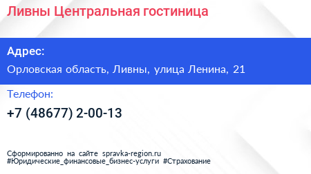 Ливны Центральная, гостиница по адресу Орловская область, Ливны, улица Ленина, 21 в дальнейшем Организация, размещена в следующих категориях: