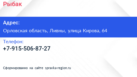 Рыбак по адресу Орловская область, Ливны, улица Кирова, 64 в дальнейшем Организация, размещена в следующих категориях: