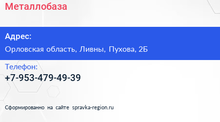 Металлобаза по адресу Орловская область, Ливны, Пухова, 2Б в дальнейшем Организация, размещена в следующих категориях: