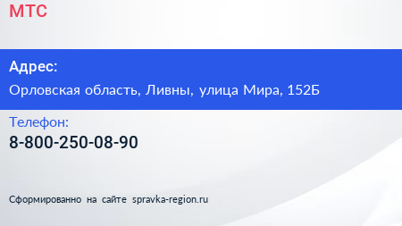 МТС по адресу Орловская область, Ливны, улица Мира, 152Б в дальнейшем Организация, размещена в следующих категориях: