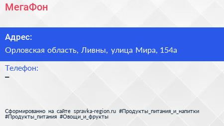 МегаФон по адресу Орловская область, Ливны, улица Мира, 154а в дальнейшем Организация, размещена в следующих категориях: