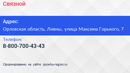 Связной по адресу Орловская область, Ливны, улица Максима Горького, 7 в дальнейшем Организация, размещена в следующих категориях: