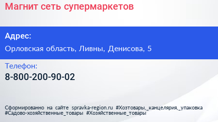 Магнит, сеть супермаркетов по адресу Орловская область, Ливны, Денисова, 5 в дальнейшем Организация, размещена в следующих категориях: