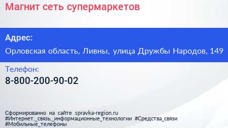 Магнит, сеть супермаркетов по адресу Орловская область, Ливны, улица Дружбы Народов, 149 в дальнейшем Организация, размещена в следующих категориях: